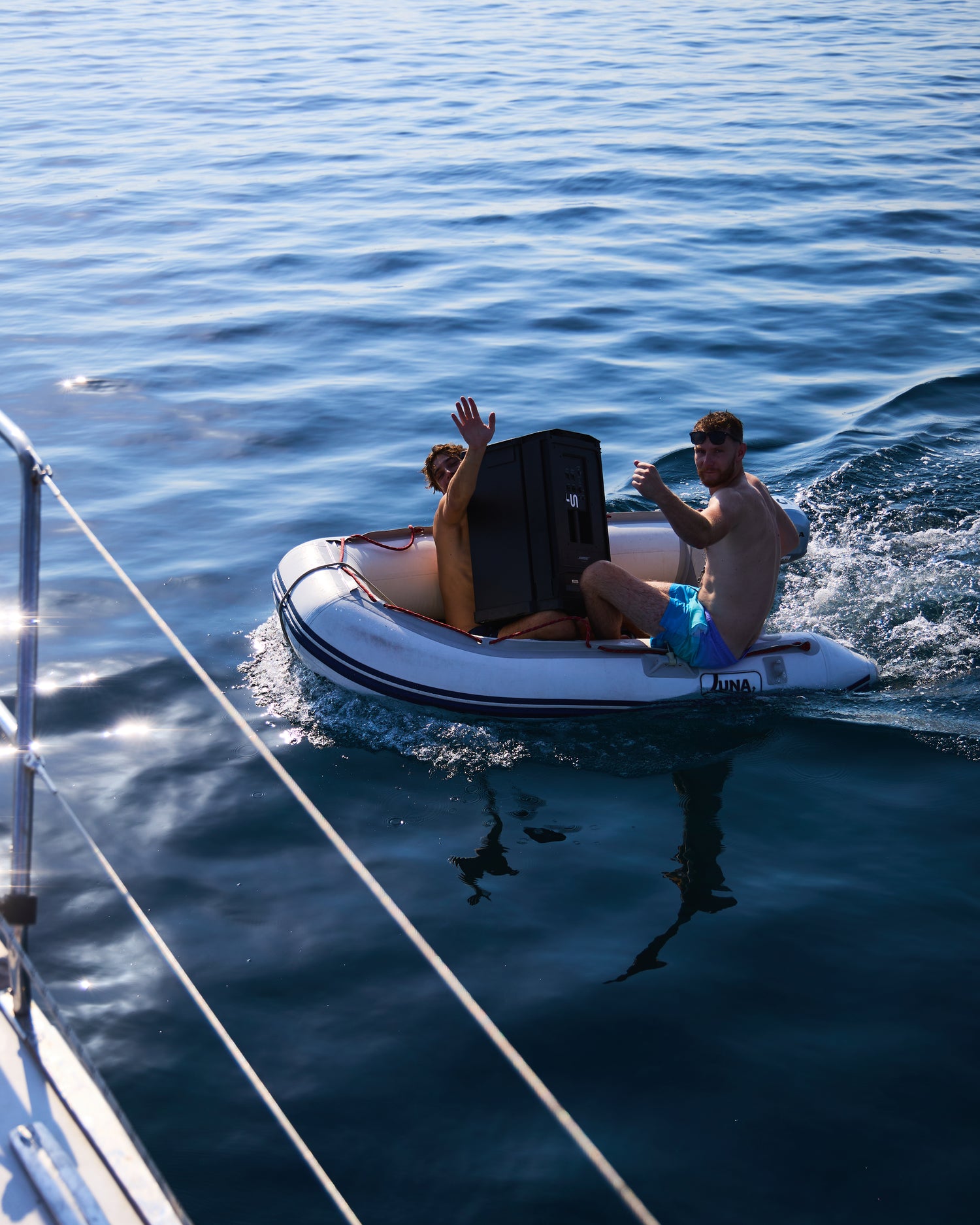 We anchor and connect all the yachts side by side to form a massive lineraft. The catamaran becomes a stage, and guests are free to move between boats. It's a floating dance floor where the music flows as freely as the people do.